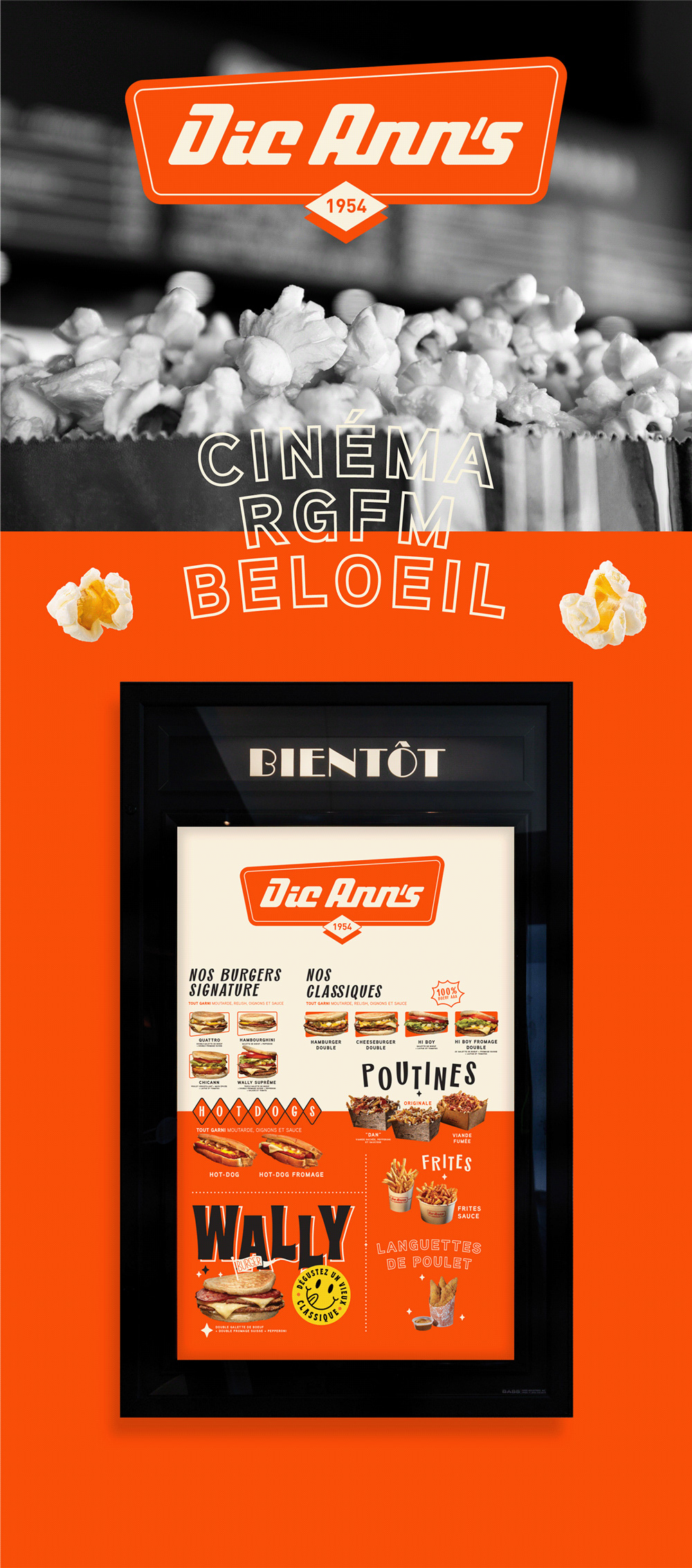 Dic Ann’s a ouvert une nouvelle succursale à l’intérieur d’un cinéma situé à Beloeil, Québec. Ils nous ont demandé de concevoir un menu géant et d’autres éléments de marque.